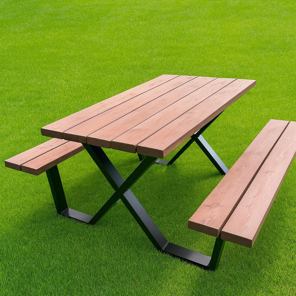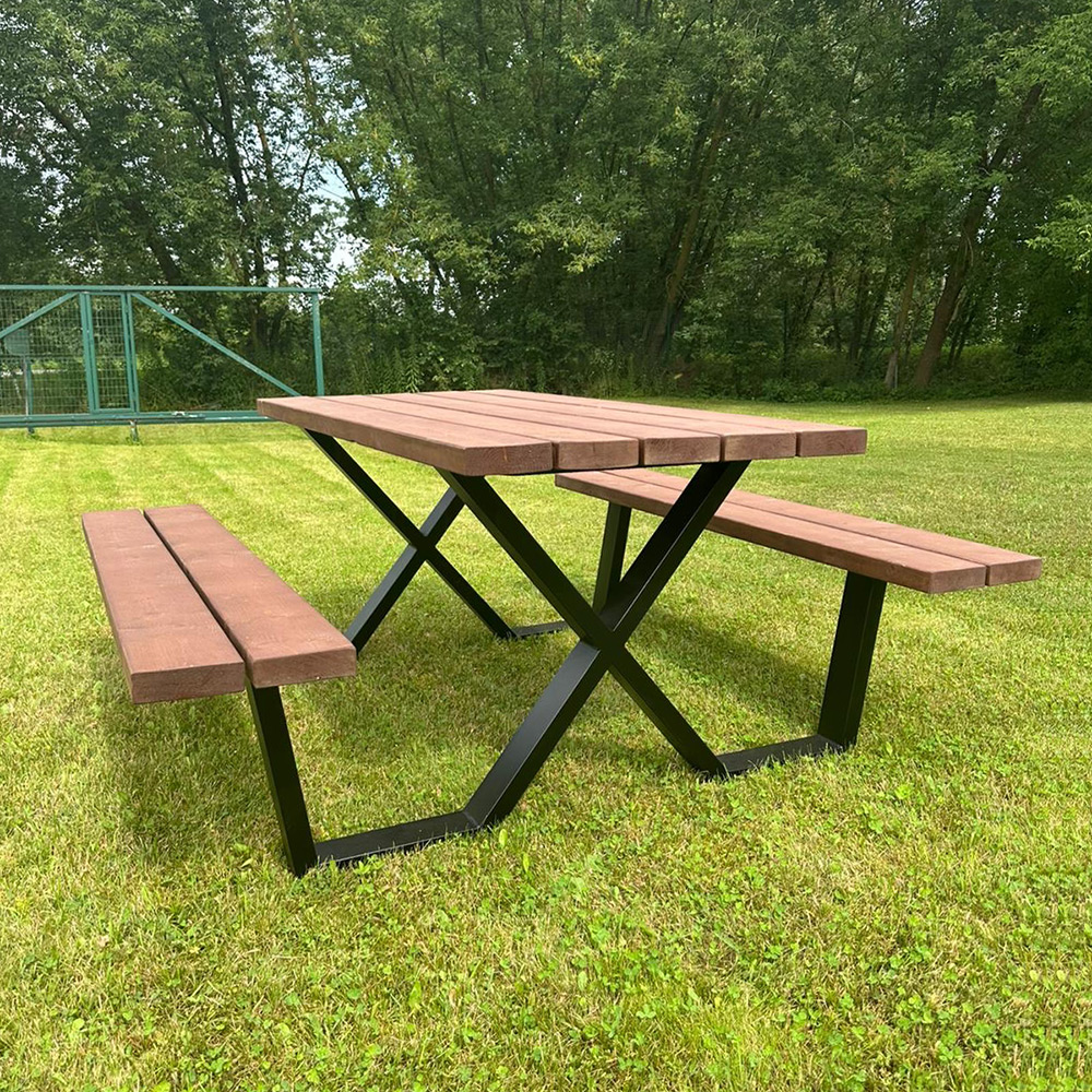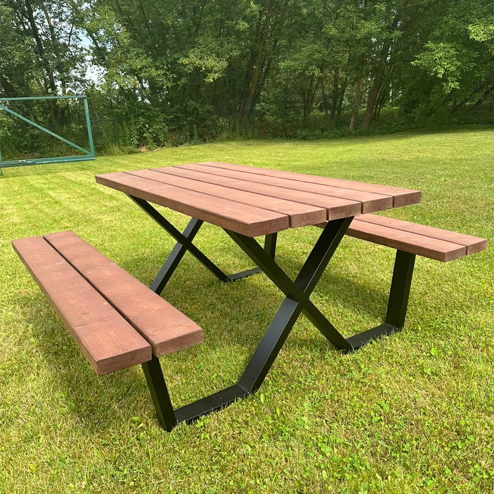• Der Tisch und die Sitzflächen sind auf einer gemeinsamen Basis befestigt und lassen sich leicht auf dem Gelände bewegen.